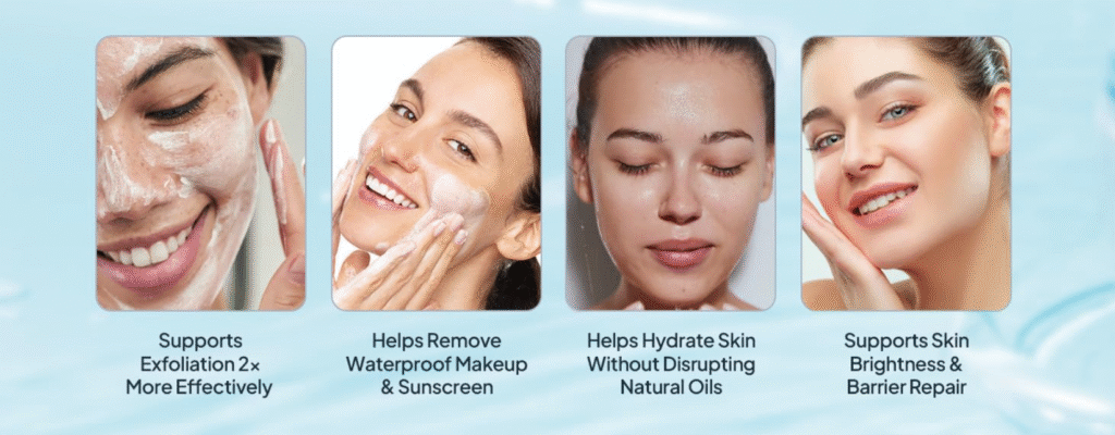 Harsh face wash aapki skin ko dry aur damage kar dete hain — lekin yeh gentle formula makeup, sunscreen aur dirt ko deeply clean karta hai bina skin barrier ko harm kiye, leaving your skin soft, hydrated and fresh.